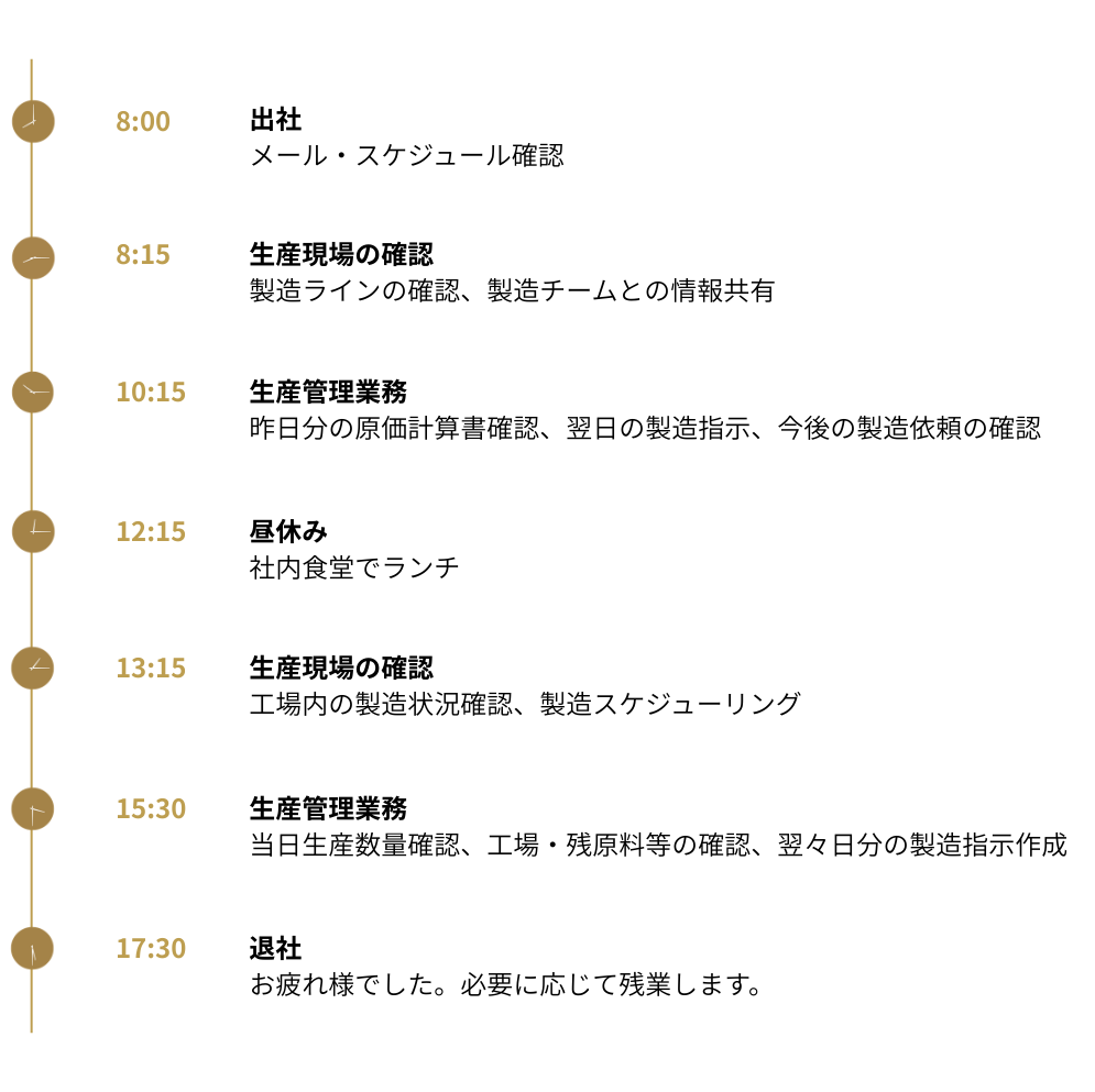 私の指示により工場の生産ラインが動くので、まずはミスをしないように心掛けています。その上で従業員の方々とのコミュニケーションの取り方に注意し、スムーズな連携、適切なマネジメントが重要だと考えております。さらには個々の従業員の方の得意、不得意を考慮しながらレベルアップできるように心掛けています。