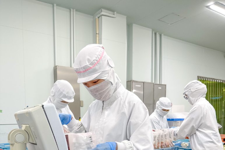 私はフライやムニエルの製造ラインに所属しております。フライ製造では、衣付したフライ原料を急速凍結し、重量測定や袋詰め、出荷用の箱詰めまで、一連のライン作業を多岐にわたって担当しております。製造が終わると次の商品の製造に取り掛かる前に、異物混入を防ぐために必ず清掃を行います。班員同士で連携を取り合い、原料や資材の準備も同時に行っております。