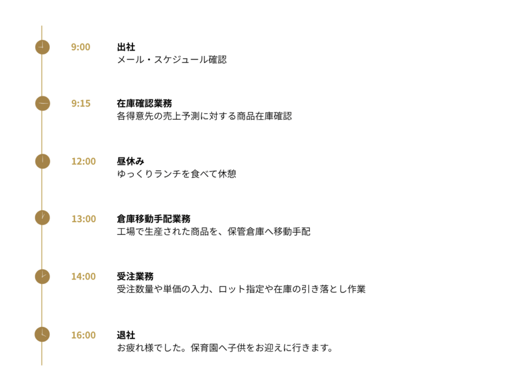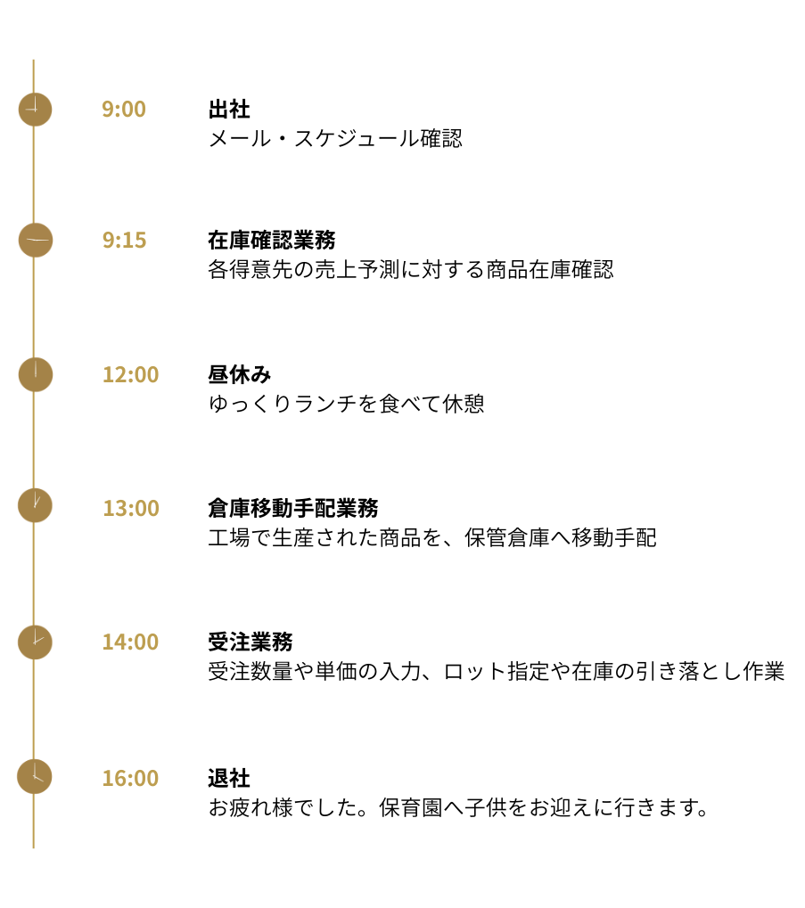 お取引先様からの発注を、システムに入力し、配送依頼やロットの指定を行います。また、商品の発注に対して、在庫が不足しないか確認や予測を立て、不足する前に、工場へ発注するよう営業担当者に伝えたり、使用している倉庫に商品を移動させたりします。食品を扱うため、賞味期限の制限などもあるので、注意して在庫の確認をします。