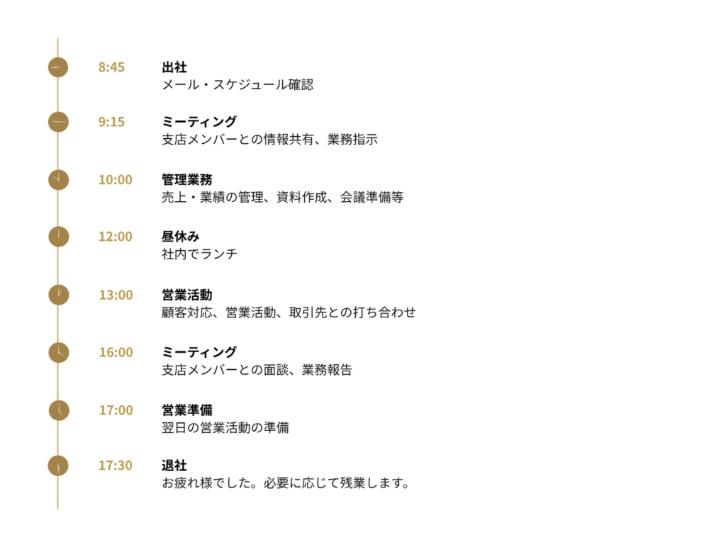 現在、私は東京支店にて支店長としての職務を務めております。支店の運営全般に責任を持ち、営業活動の推進、スタッフの管理・育成、収益の最大化を目指した戦略の立案・実行などの業務を担当し、会社および支店の成長と企業価値の向上に努めております。