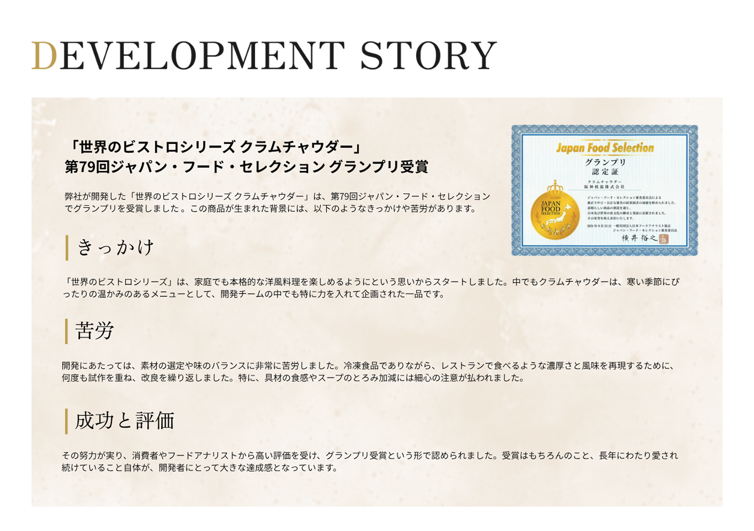 成功を実感することは多くありません。むしろ、日々の業務の中では試行錯誤の連続で、失敗の積み重ねのように感じることも少なくありません。それでも、自分が開発に携わった商品が10年以上にわたって販売され続けていたり、現在の商品においてもその基礎が活かされているのを見ると、大きな達成感を覚えます。そうした積み重ねが、少しずつ形になって残っていくことに、仕事の誇りを感じています。