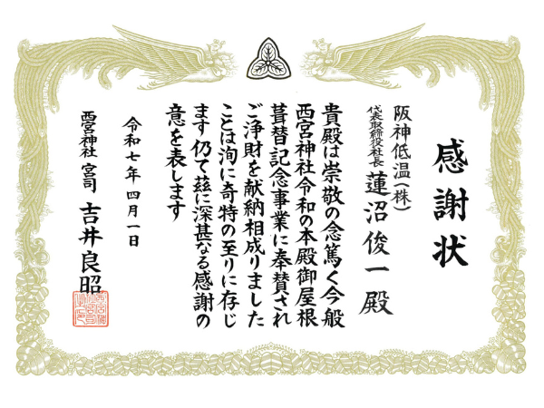 この度、西宮えびす神社の「本殿御屋根葺替記念事業」に奉賛し、感謝状を頂きました。
