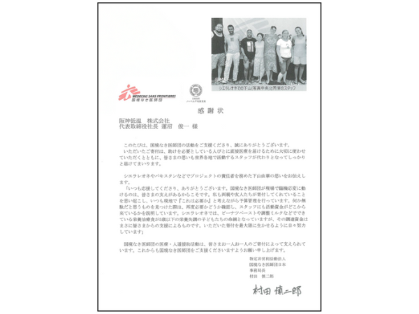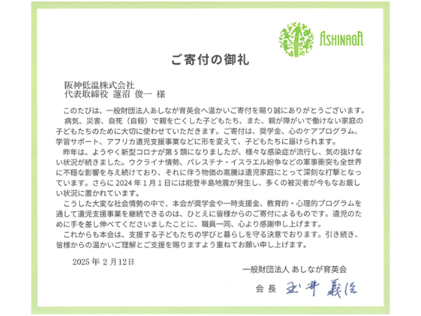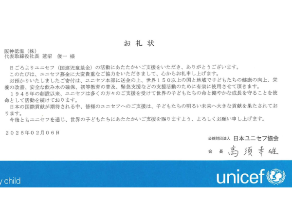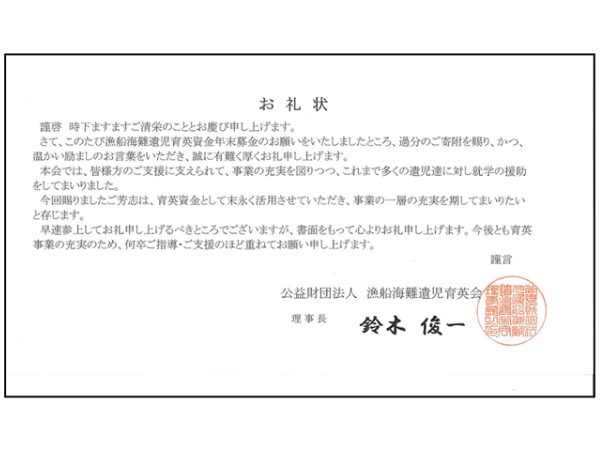 社会貢献活動の一環として「公益財団法人日本ユニセフ協会(国際連合児童基金)」・「国境なき医師団」・「一般財団法人 あしなが育英会」・「公益財団法人 漁船海難遺児育英会」・「日本赤十字社」に寄付させていただき、感謝状、お礼状を拝受しました。