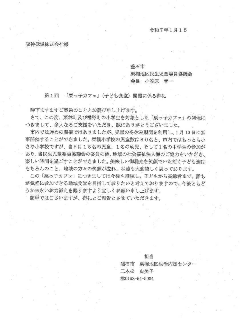 釜石市の子供食堂「栗っ子カフェ」に食材を提供しました