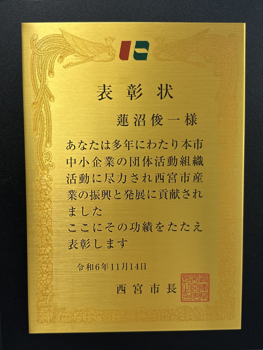 弊社代表取締役社長 蓮沼俊一が西宮市中小企業振興功労者として表彰を受けました。西宮市の商工業の発展・近代化のため、団体活動や組織活動を通じて、中小企業の振興に尽力された功績を称えられました。