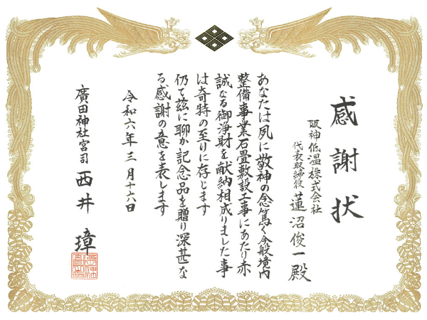 廣田神社より感謝状を拝受いたしました