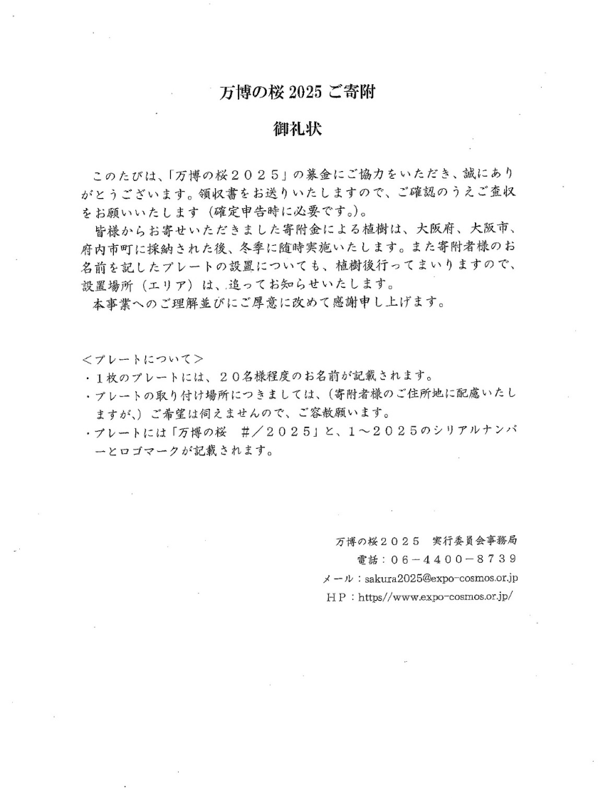 昨年末に「万博の桜2025」という桜の植樹活動に賛同し寄付をさせていただいたことにより、万博の桜2025 実行委員会事務局からお礼状を拝受いたしました。植樹した桜の木には「阪神低温(株)」と社名の入りのプレートが設置される予定です。