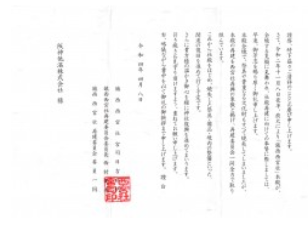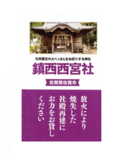 えびす宮総本社「西宮神社」から九州ではじめて分祀されました、佐賀の「鎮西西宮社」が2019年11月に全焼しました。社殿再建に向けた事業に奉賛を行い、宮司様よりお礼状を拝受いたしました。