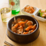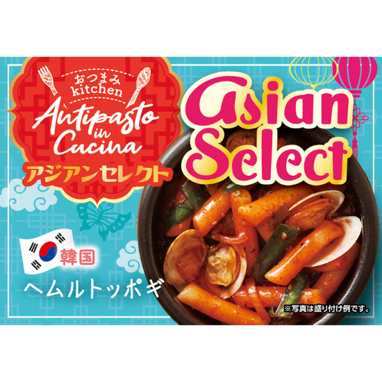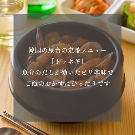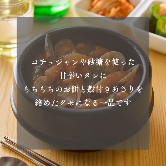 原材料 米加工品(トッポギ)(国内製造)、殻付きボイルあさり(中国製造)、調味料〔醤油、砂糖、ぶどう糖加藤液糖、おろしにんにく、コチュジャン調味料、植物油、唐辛子、豆板醤、XO醤、いりごま、たまねぎエキス、ねぎペースト、ビーフエキス、酵母エキス、コショウ、寒天〕、玉ねぎ(中国産)、にら(中国産) / 増粘剤(加工デンプン、増粘多糖類)、調味料(アミノ酸等)、グリシン、ベニコウジ色素、pH調整剤、カラメル色素、パプリカ色素、セルロース、甘味料(ステビア)、香料、酸味料(一部にえび・小麦粉・牛肉・ごま・大豆・豚肉・りんごを含む)