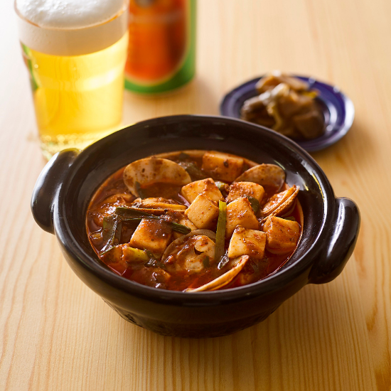 | 原材料 | 冷凍豆腐(国内製造)、調味料〔植物油(なたね油、香味油)、豚肉加工品、ねぎ、醤油、豆板醤加工品、生姜、砂糖、唐辛子、米発酵調味料、甜麺醤、ビーフエキス、ポークエキス、オイスターエキス、にんにく、乾燥にんにく、醸造酢、トウチ、花椒、コショウ、酵母エキス、唐辛子末〕、殻付きボイルあさり(中国製造)、にら(中国産) / 安定剤(加工澱粉)、調味料(アミノ酸等)、凝固剤(塩化マグネシウム)、カラメル色素、pH調整剤、香料、増粘多糖類、セルロース、加工澱粉(一部に小麦、牛肉、ごま、大豆、鶏肉、豚肉、ゼラチンを含む) |