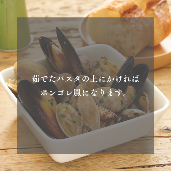 ガーリックの風味と魚介のうま味が広がったオイルにパンを浸して食べたり、パスタの具材として食べたりと様々なアレンジでもお楽しみいただけます。忙しい日の食卓にも、ちょっと贅沢したい時にもぴったりです。