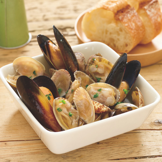 うま味たっぷりの殻付きあさりとムール貝をガーリックの効いたバジルバターソースを合わせ、蒸し焼き風にしました。電子レンジで加熱するだけでバジルバターと2種の貝の豊かな風味が広がり、本格的な味わいを手軽にお楽しみいただけます。