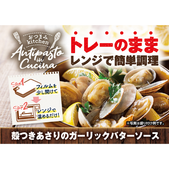 | 原材料 | ボイルあさり(中国製造)、ソース〔米発酵調味料、水あめ、おろしにんにく、マーガリン、 ぶどう発酵調味料、食塩、乳加工品、にんにく末、バター、コショウ末、乾燥パセリ、 バジル〕 / 調味料(アミノ酸等)、酒精、酸味料、増粘剤(キサンタン)、香料、クチナシ色素、 アナトー色素 |