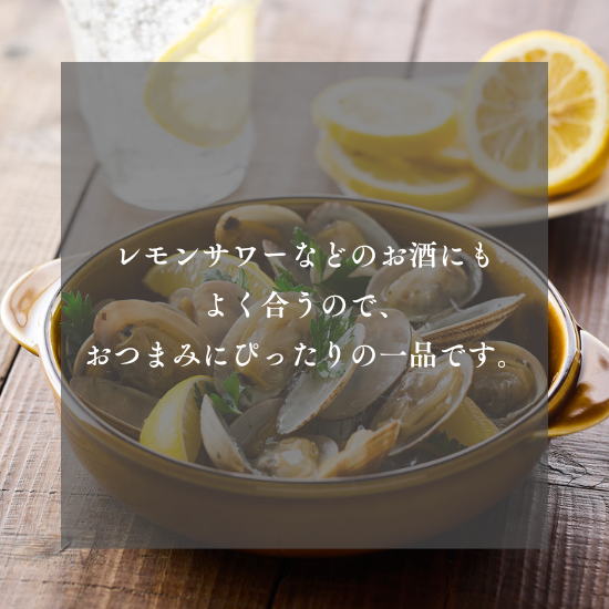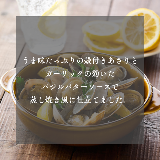 うま味たっぷりの殻付きあさりとガーリックの効いたバジルバターソースを合わせ、蒸し焼き風に仕立てました。ワインやレモンサワーなどのお酒に良く合う味付けのため、おつまみにもぴったりの商品です。