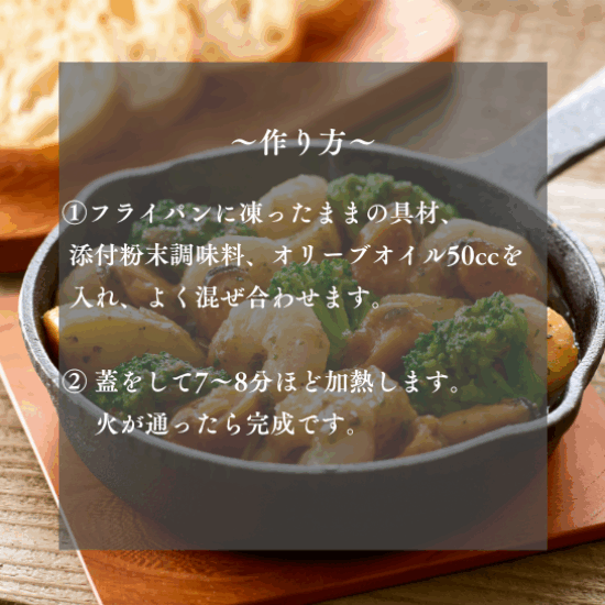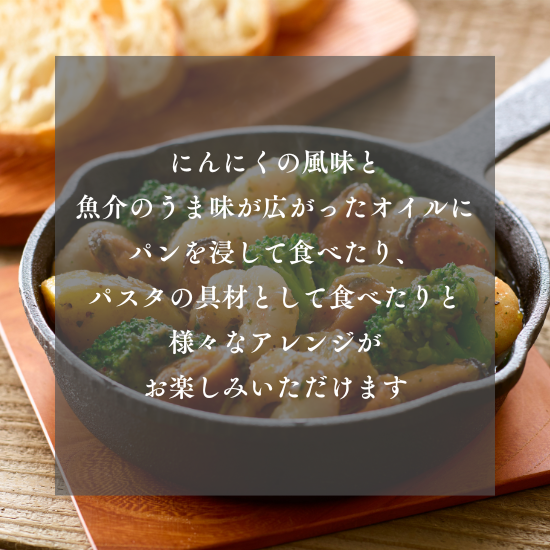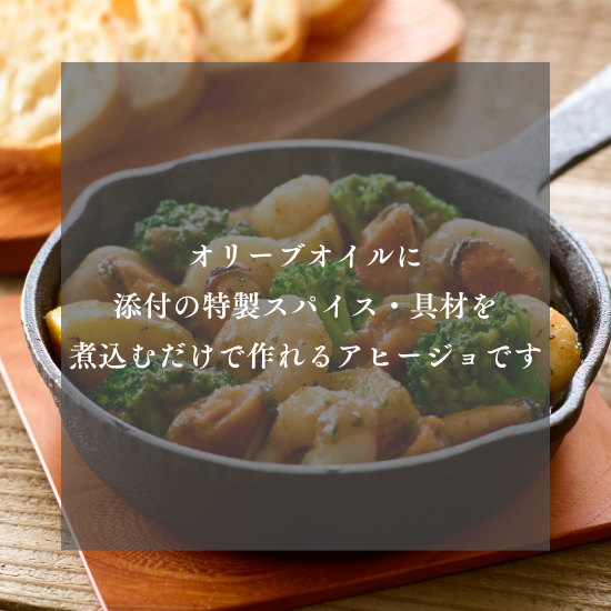 オリーブオイルと添付の特製スパイス、具材を煮込むだけで簡単に作れるアヒージョです。にんにくの風味と魚介のうま味が広がったオイルにパンを浸して食べたり、パスタの具材として食べたりと様々なアレンジでもお楽しみいただけます。