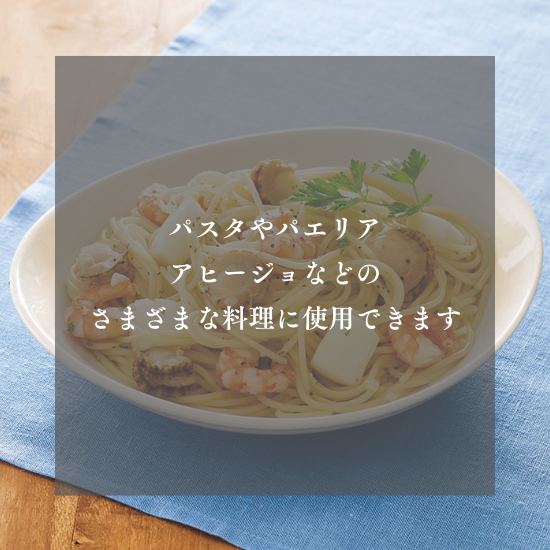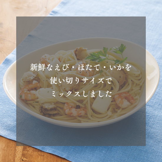 新鮮なえび・ほたて・いかを使い切りサイズでミックスしました。パスタやパエリア、アヒージョなどのさまざまな料理に使用できます。