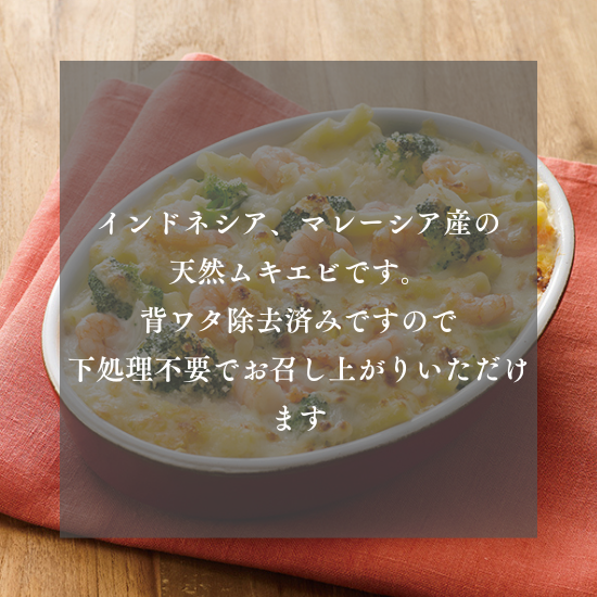 インドネシア、マレーシア産の天然ムキエビです。背ワタ除去済みですので下処理不要でお召し上がりいただけます。
