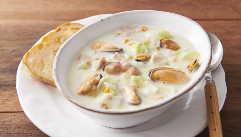 ミネラル豊富なムール貝のクラムチャウダー。冬の寒い時期には体が温まる一品です。