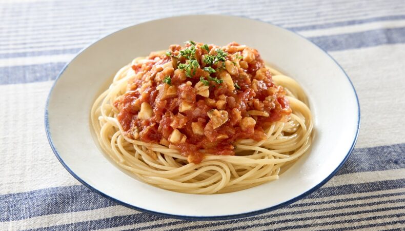 2. ベーコンは1cm角の棒状に切り、 トマトはヘタを取ります。