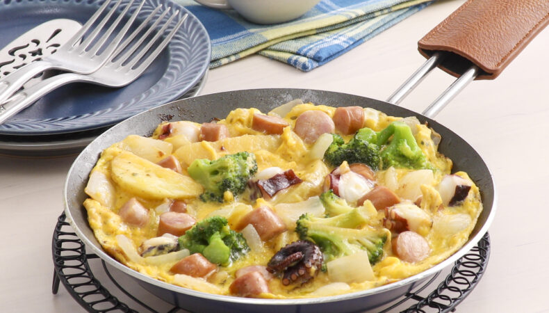 1. 鍋にオリーブオイルを中火で熱し、タマネギ、ベーコン、凍ったままのアヒージョの具材を炒めます。