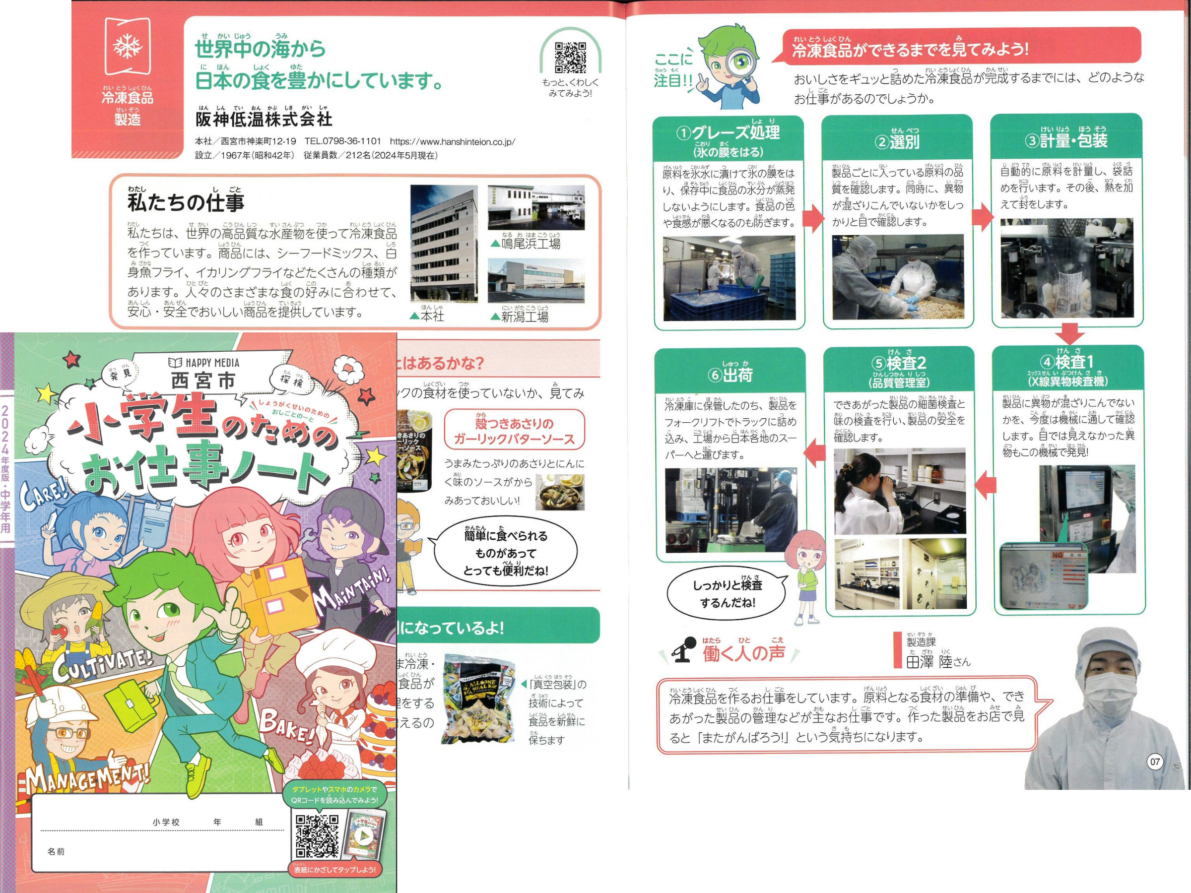 西宮市の小学生(中学年向け)に配布される「小学生のためのお仕事ノート」に阪神低温株式会社が掲載されました。ここでは、弊社商品や工場での生産の流れが分かりやすく紹介されています。